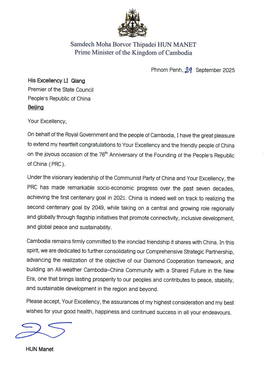 ព័ត៌មានជាតិ សារលិខិតអបអរសាទរ របស់ សម្ដេចមហាបវរធិបតី ហ៊ុន ម៉ាណែត នាយករដ្ឋមន្ត្រីនៃព្រះរាជាណាចក្រកម្ពុជា ជូន ឯកឧត្តម លី ឈាង នាយករដ្ឋមន្ត្រី នៃសាធារណរដ្ឋប្រជាមានិតចិន ក្នុងឱកាសដ៏រីករាយ នៃខួបលើកទី ៧៦ នៃការបង្កើតសាធារណរដ្ឋប្រជាមានិតចិន សហការី September 30, 2025 សារលិខិតអបអរសាទរ របស់ សម្ដេចមហាបវរធិបតី ហ៊ុន ម៉ាណែត នាយករដ្ឋមន្ត្រីនៃព្រះរាជាណាចក្រកម្ពុជា ជូន ឯកឧត្តម លី ឈាង នាយករដ្ឋមន្ត្រី នៃសាធារណរដ្ឋប្រជាមានិតចិន ក្នុងឱកាសដ៏រីករាយ នៃខួបលើកទី ៧៦ នៃការបង្កើតសាធារណរដ្ឋប្រជាមានិតចិន។ Post navigation Previous: កម្លាំងសមត្ថកិច្ចស្រុកកណ្តាលស្ទឹង ឃាត់ខ្លួនក្រុមជនសង្ស័យ៣នាក់ជាជនជាតិវៀតណាម ធ្វើសកម្មភាពដើរចងការប្រាក់ (លុយរាប់) ដោយយកសៀវភៅគ្រួសារ និងអត្តសញ្ញាណប័ណ្ណរបស់ប្រជាពលរដ្ឋជាការបញ្ចាំNext: លទ្ធផលនៃការអញ្ជើញចូលរួមរបស់ ឯកឧត្ដម ប្រាក់ សុខុន ឧបនាយករដ្ឋមន្ត្រី រដ្ឋមន្ត្រីការបរទេស និងសហប្រតិបត្តិការអន្តរជាតិ នៅក្នុងកិច្ចពិភាក្សាទូទៅនៃមហាសន្និបាតអ.ស.ប. លើកទី៨០ នៅទីក្រុងញូវយ៉ក
